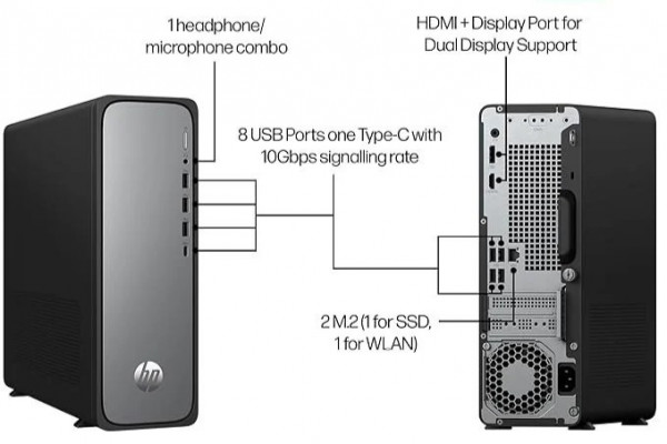 | Cổng kết nối – phía trước | 1 USB-C 10Gbps + 3 USB-A 5Gbps + 1 combo headphone/mic |